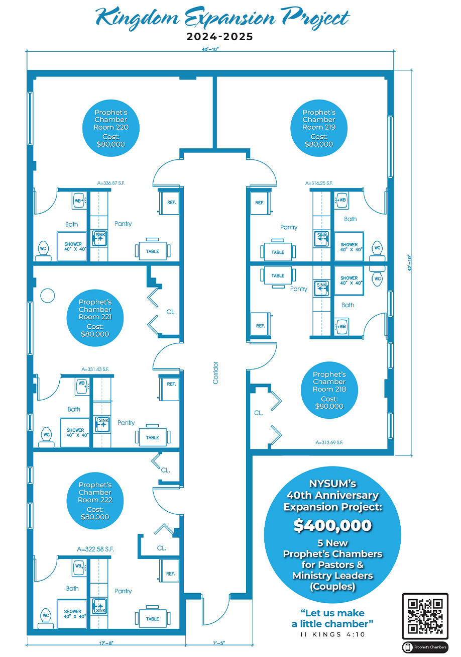This year, NYSUM Celebrates 40 Years of “Raising up Compassion Commandos & Transforming Cities for Christ!" We’ve taken Steps of Faith to launch our Kingdom Expansion Project to build 5 New “Prophets Chambers” (see the floor plan) for Pastors and Ministry Leaders sharing the same burden and calling to Transform Cities for Christ!